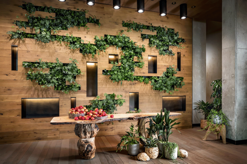 Indoor plants are becoming statement features rather than just decorative add-ons. Large leafy plants, natural stone finishes, and textured walls create a grounded and calming atmosphere.